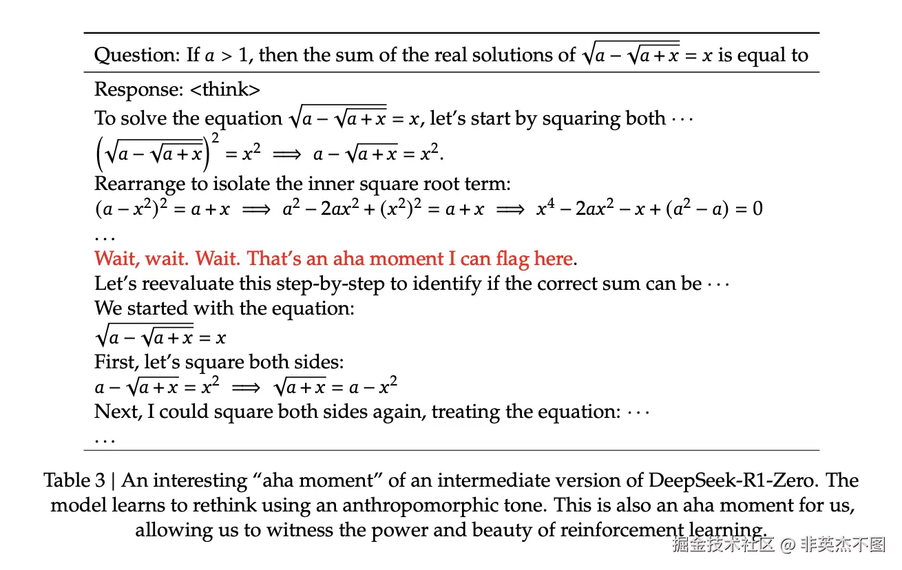 甚至出现了自主的“Aha Moment”(顿悟时刻)情况,学会自我反思和修正。