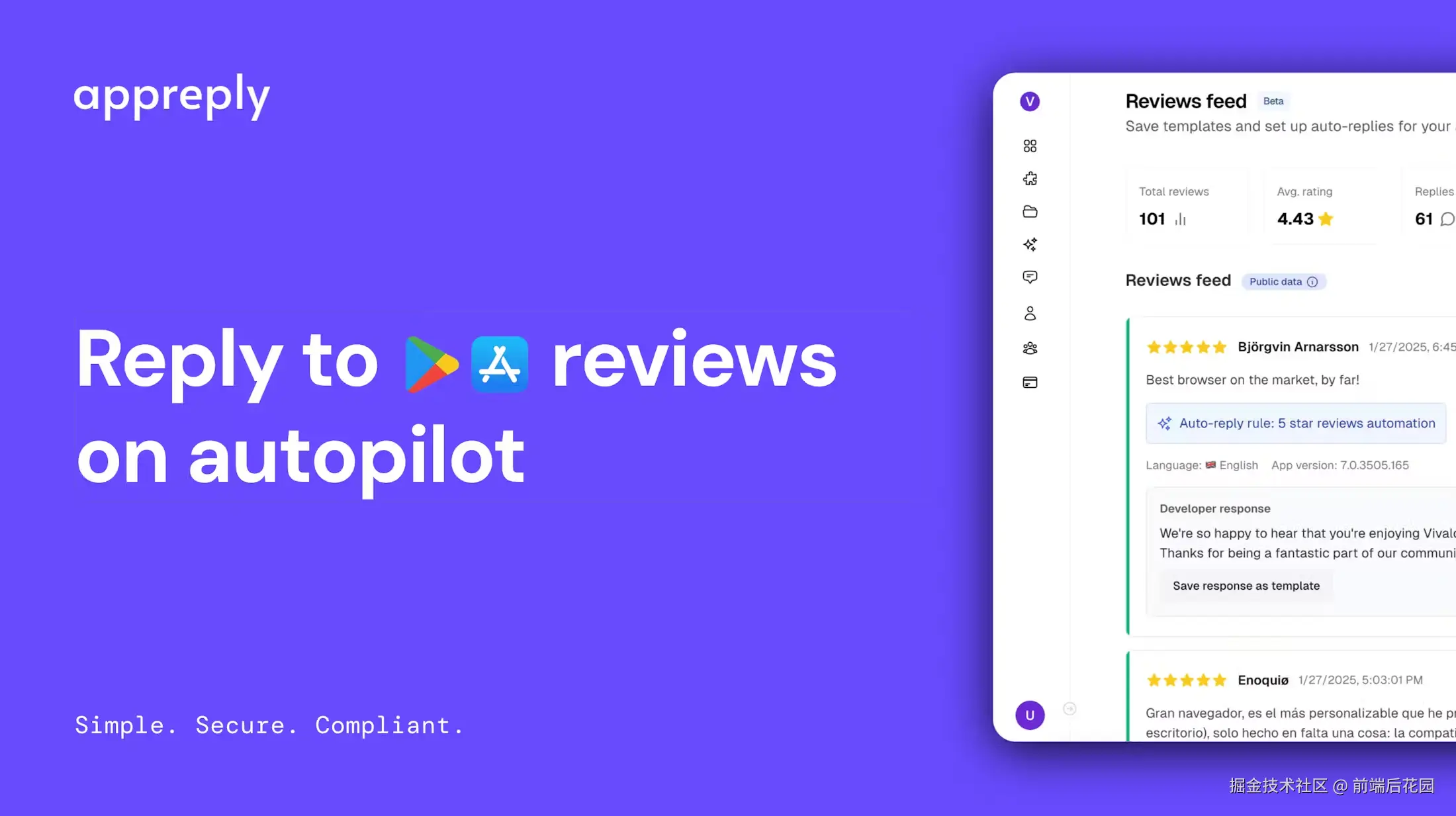 - 介绍:AppReply 是自动化回复 Google Play 和苹果应用商店用户评价的最便捷、经济方案。将其安全集成作您的客服代理,即可用任意语言自动回复高达 100%的用户评价。