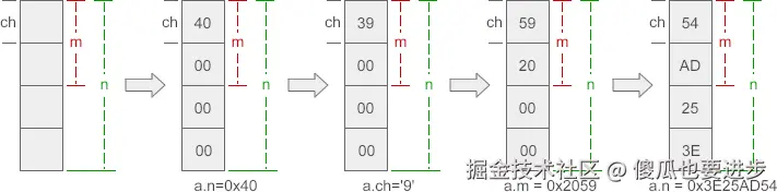结构体占用的内存大于等于所有成员占用的内存的总和(成员之间可能会存在缝隙,总大小需要是内部基本类型的整数倍,比如有2 4字节,最终大小为8个字节),共用体占用的内存等于最长的成员占用的内存。共用体使用了内存覆盖技术,同一时刻只能保存一个成员的值,如果对新的成员赋值,就会把原来成员的值覆盖掉。