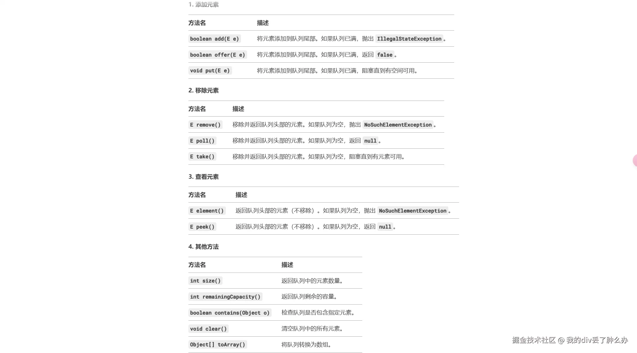 1,E remove()移除并返回队列头部的元素。如果队列为空,抛出 NoSuchElementException,最好抛出异常。