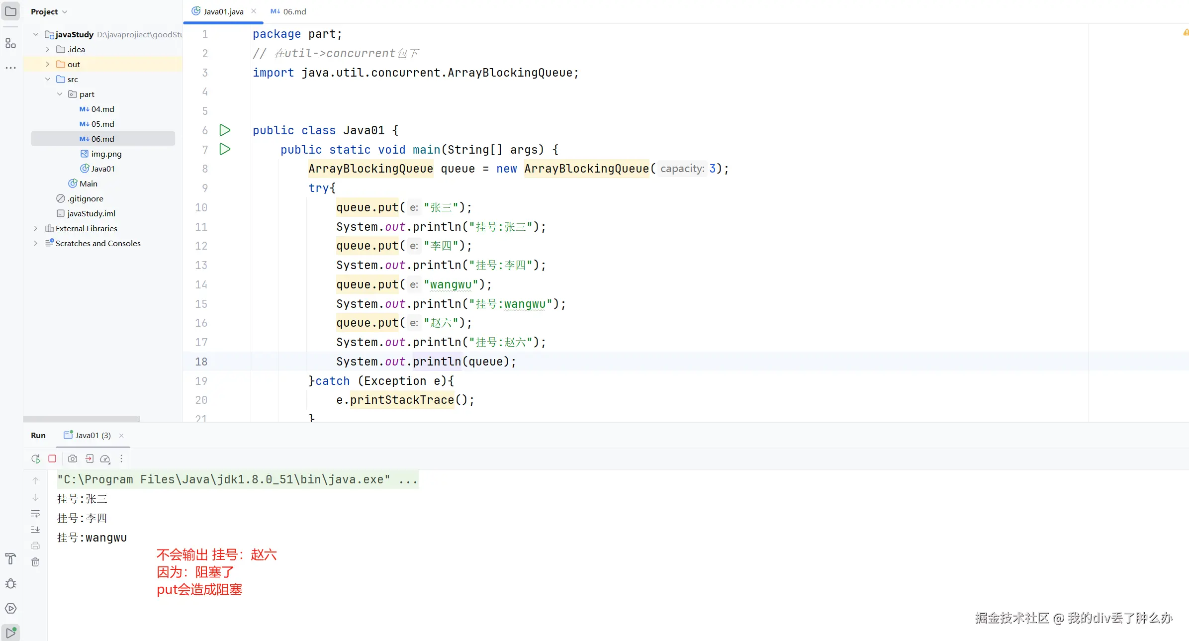 ArrayBlockingQueue.put 添加元素,超出设置的长度会造成阻塞