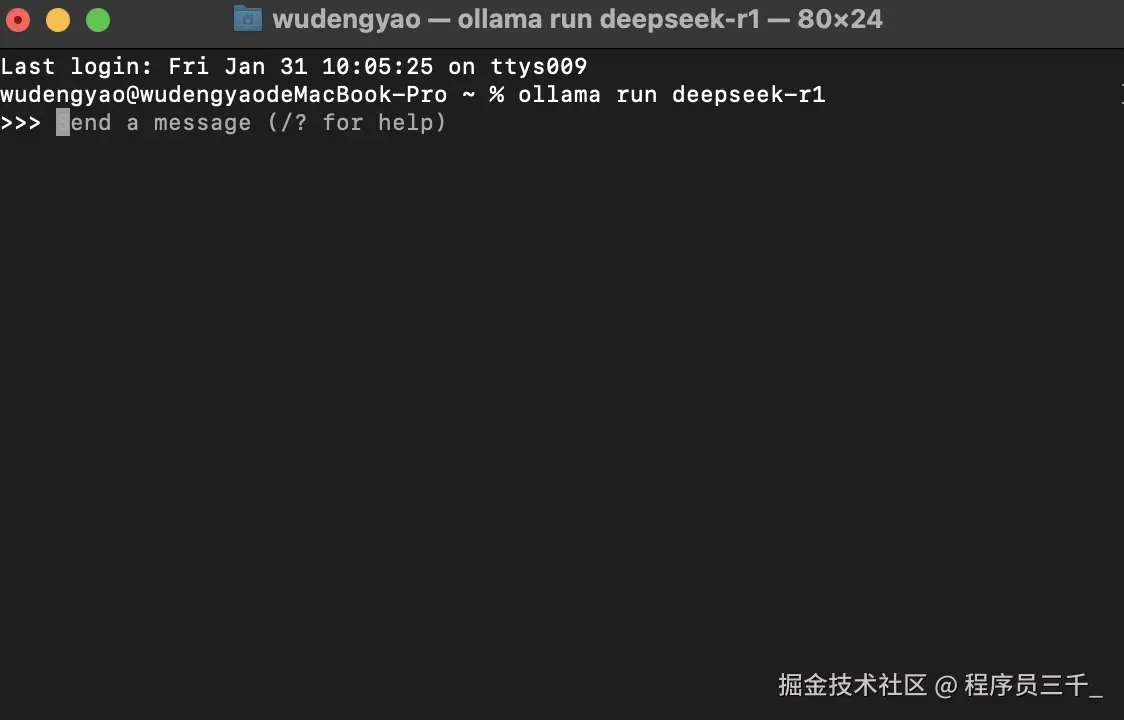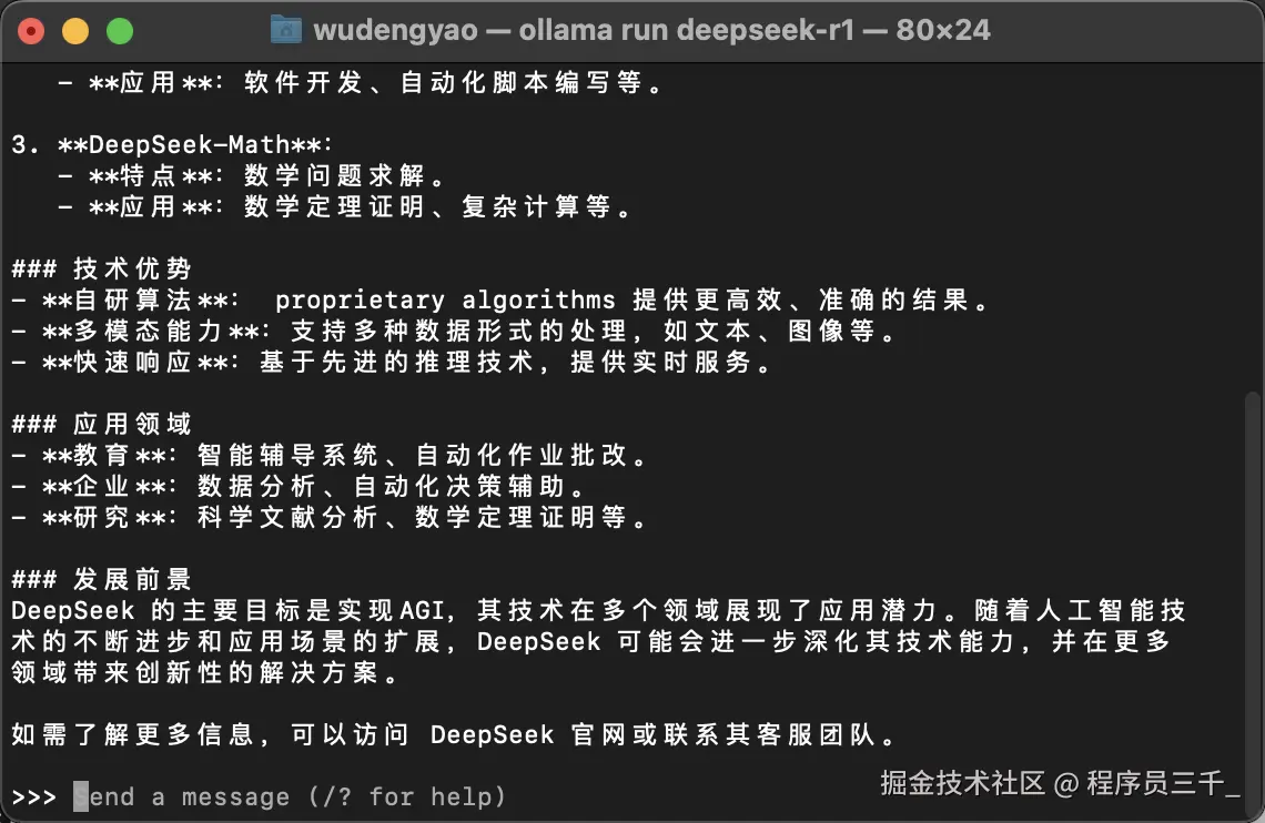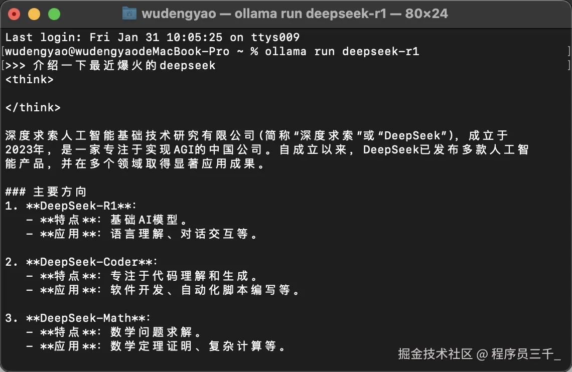 比如说,我们试一下啊!让他介绍一下最近爆火的deepseek,按回车。好,现在他开始思考了,可以看到,这个速度是挺快的,当然这个主要取决于你的电脑配置哈,配置越好,速度越快。OK,这个结果出来,上面是思考过程,下面是输出的结果。