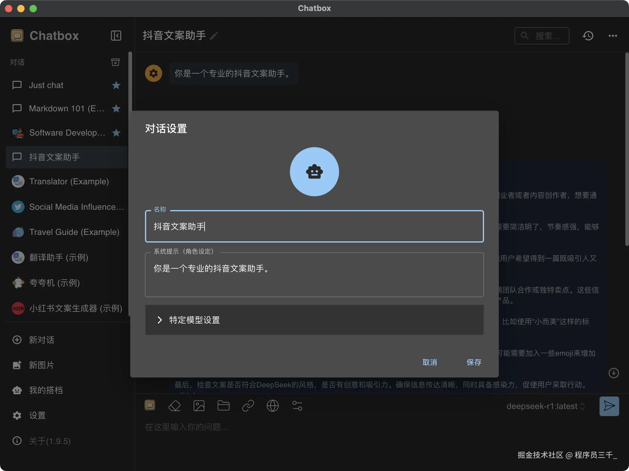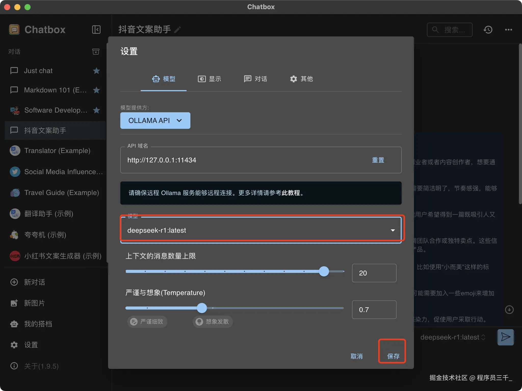 重启ollama以后,我们重新打开chatbox,这里就会出现deepseek r1这个模型,点击保存。