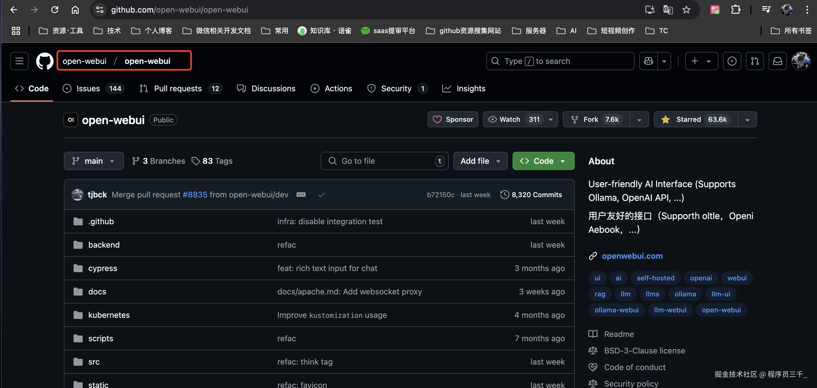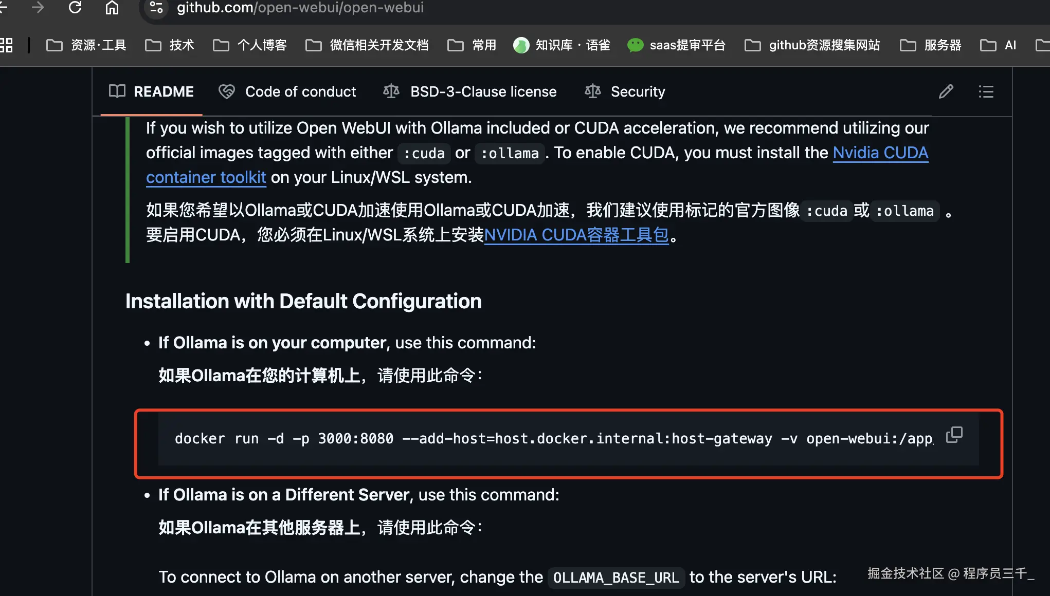 接下来我们还需要到 Github 上去找到 open-webui 这个项目,然后我们进来往下滑,找到这里docker安装的步骤。