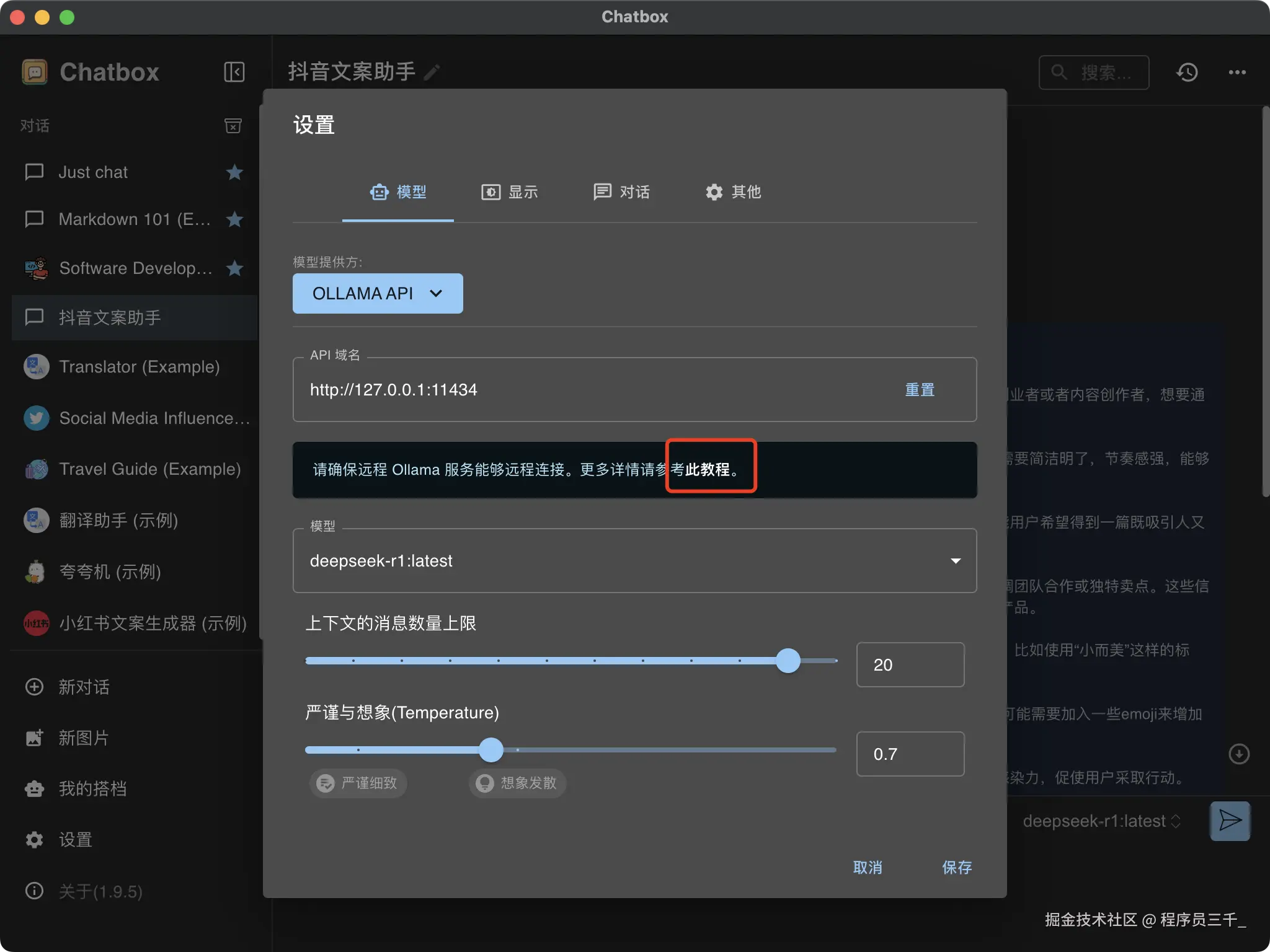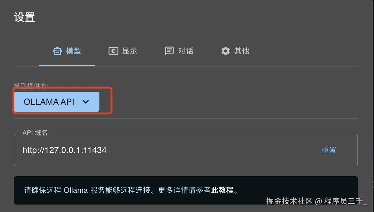 我们进入chatbox主页,使用本地自己的 API,然后这样选ollama api。然后在这里注意哈,他为了确保ollama服务能远程链接,要看这个教程。