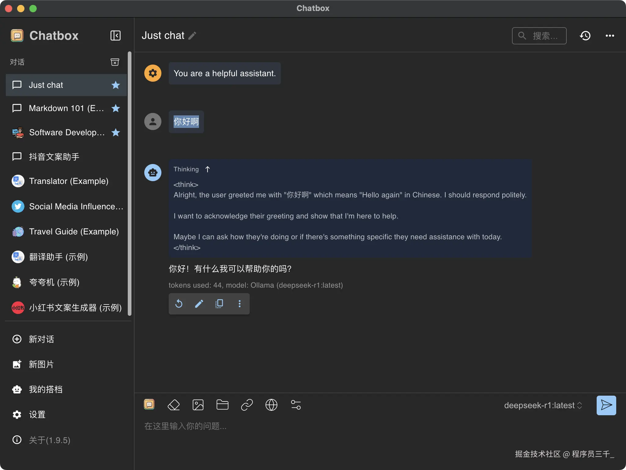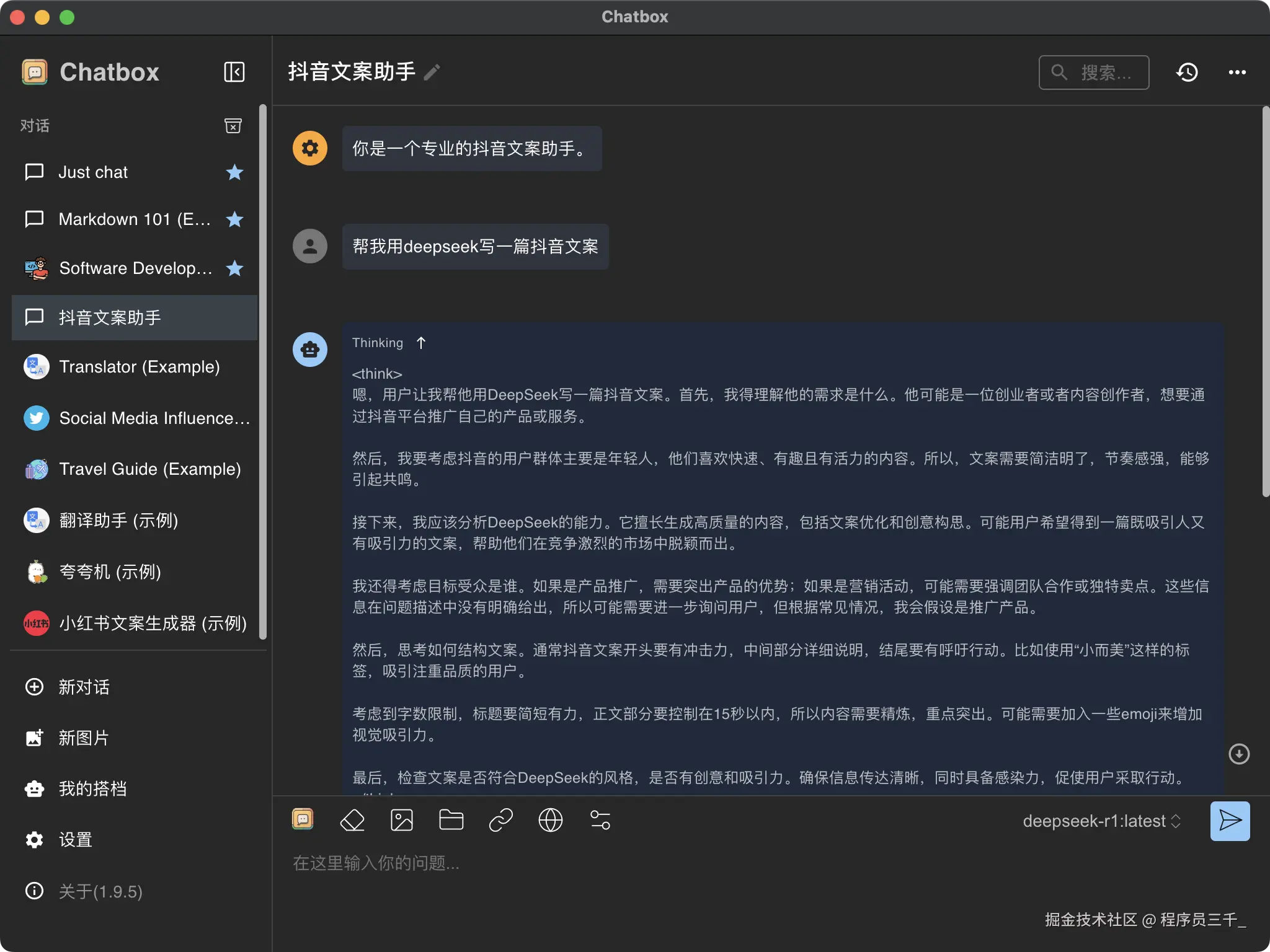 上面这个是他的思考过程,下面这个是他输出给我的答案。完全免费,一点都不卡顿,并且不需要联网,在你本地就能使用。这就是我们部署到本地的 chatbox 方案。