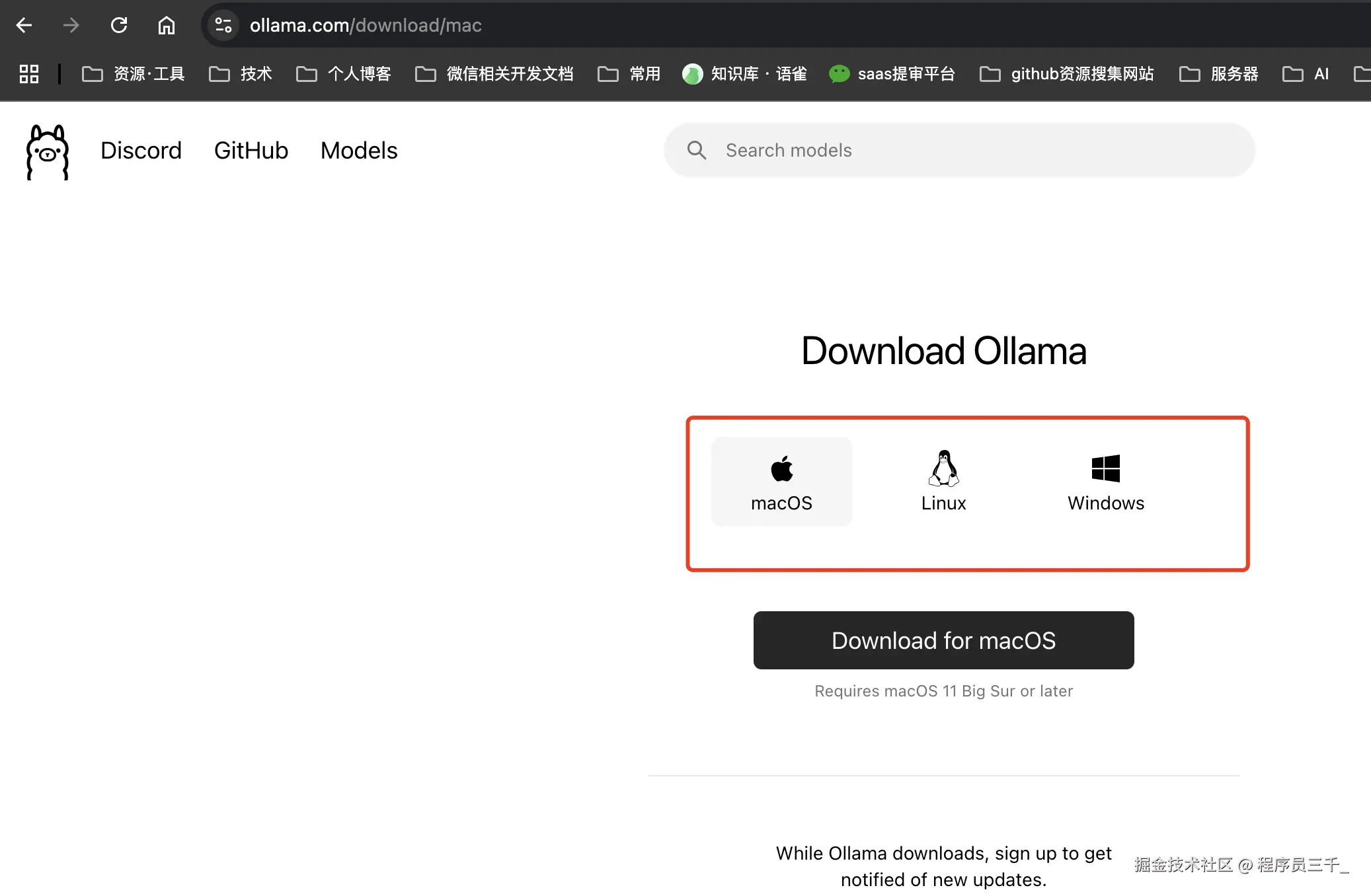 首先,我们想要在本地运行 deepseek,需要用到一个叫ollama(欧拉玛)的工具,这是一个开源的本地大模型运行工具,我们搜索一下,进入到ollama的官网,然后这里有一个下载的按钮,点击一下,选择你对应的操作系统,我用的是 Mac 电脑,所以我选择 Mac OS,当然你也可以下载 windows 的版本,后面的操作步骤都是一样的,我这里已经下载完成了,然后默认安装它就行,当你安装成功之后,你的电脑上方会出现一个羊驼的图标。