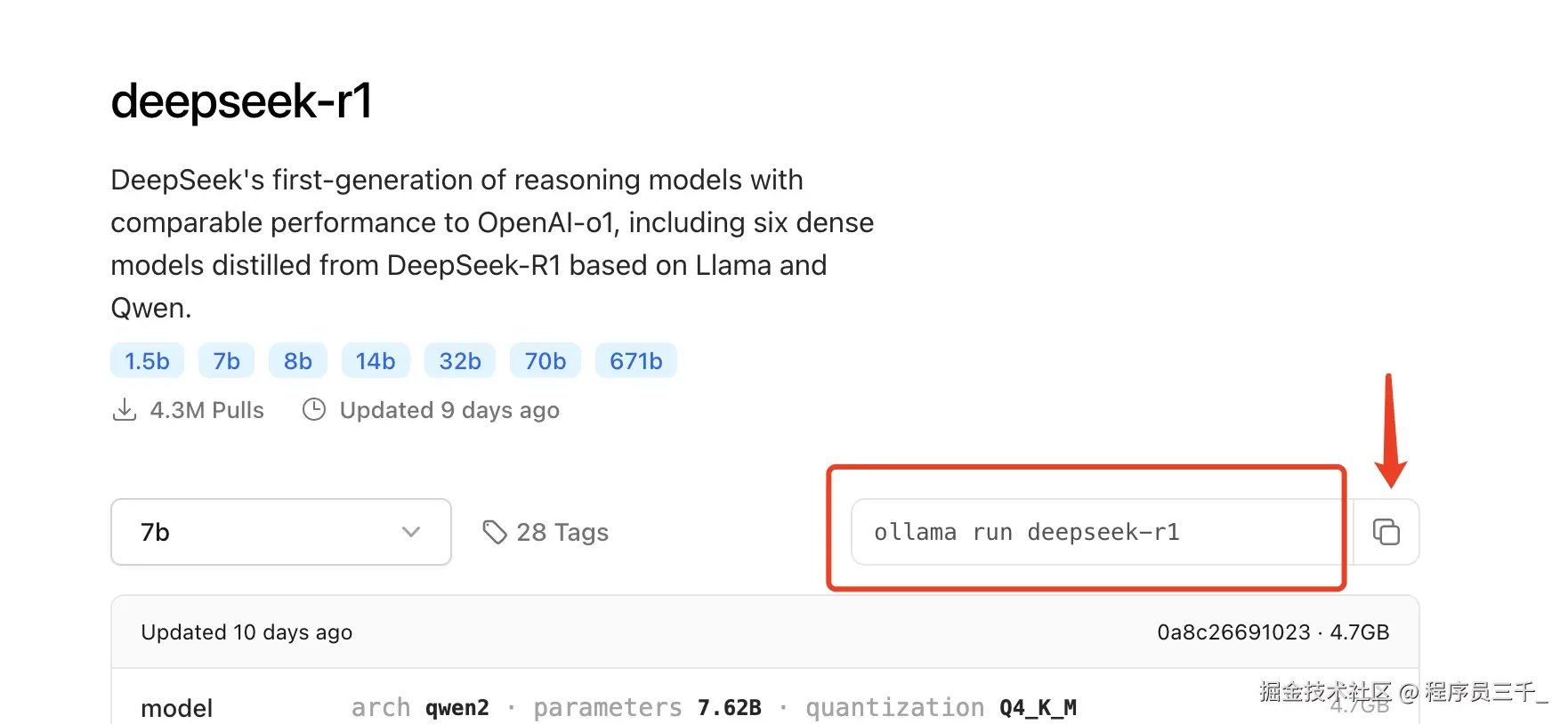 然后,我们点击主页的 这个models菜单,这里面有很多热门的开源大模型,我们选择第一个deepseek r1模型就行,这里有多个版本可以选择,这个需要根据你自己的电脑配置自行选择合适的就行了,数字越大,需要的电脑配置越高。