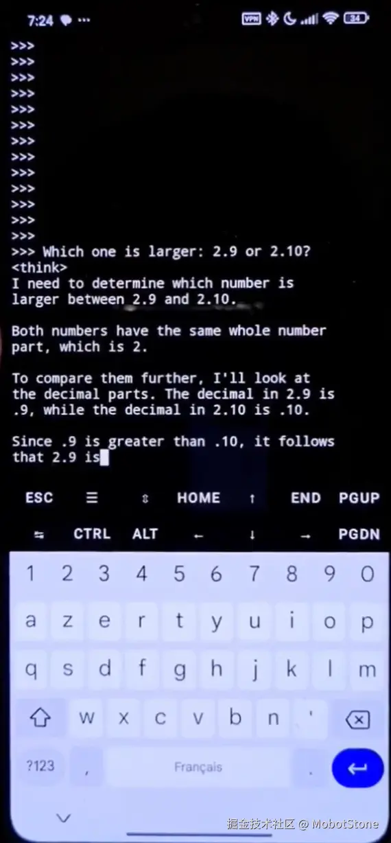 下载完成后,Termux 终端里会出现交互界面,你可以像在 PC 上那样使用 LLM。不过别对性能抱太高期待,毕竟这是在手机上运行的“小型”模型,速度肯定比不上 ChatGPT。