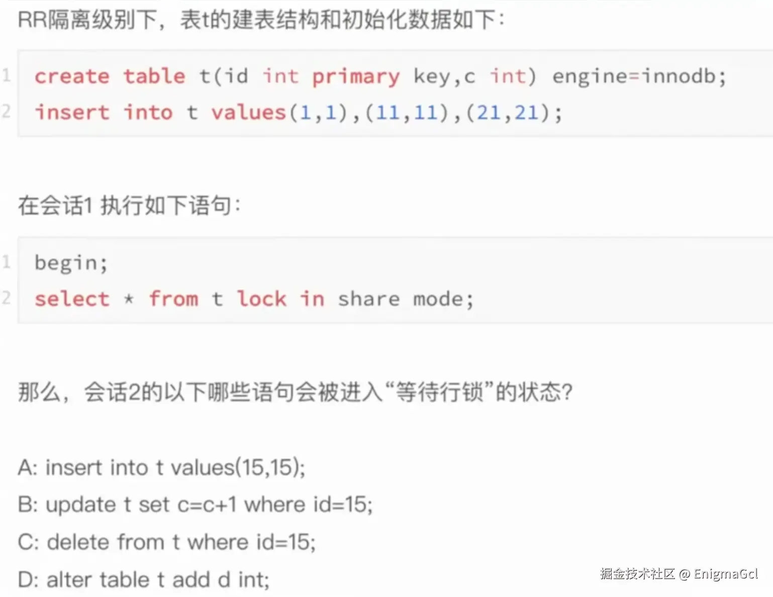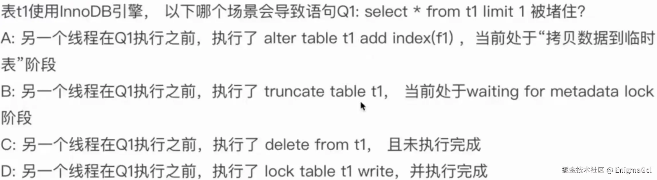 答案是 A,B、C 由于指定 id 不存在,不会有锁,D 是在等待 MDL X 锁而不是行锁,如果该语句最终被计入了慢查询日志,那么慢查询日志中的 lock_time 是否包含等待 MDL 锁的时间?答案是不包含,慢查询不记录表锁和 MDL 锁时间,只有行锁相关的时间,比如行锁、间隙锁以及 Next-key lock。