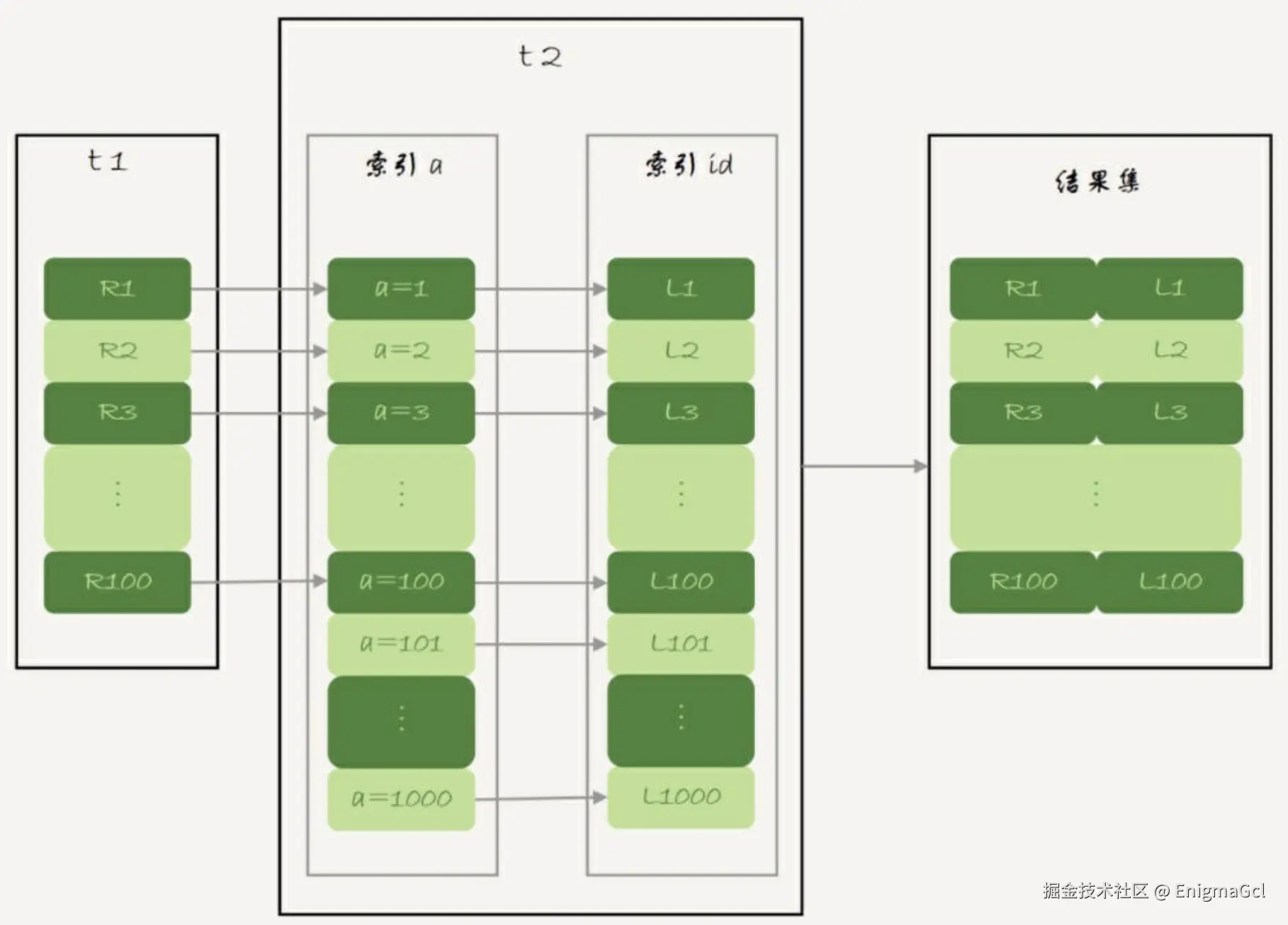 select * from t1 join t2 using (a);执行流程为:先查询 t1 得到 100 行数据,然后使用 a 的值去 t2 的索引 a 上查询得到 id,回表得到 t2 的行,组装在一起得到结果集中一行,上面的结果集并不需要占用 join buffer,因为每得到一行就能直接返回给客户端