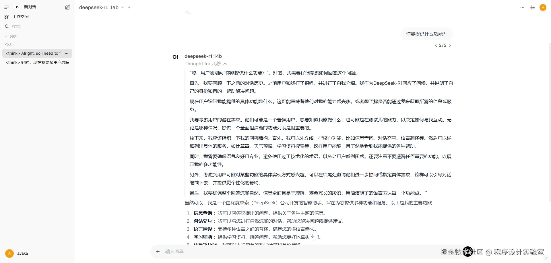 和 DeepSeek 模型对话,这个14b的模型就感觉效果已经不错了,如果完整版模型就更好,真的未来可期啊!