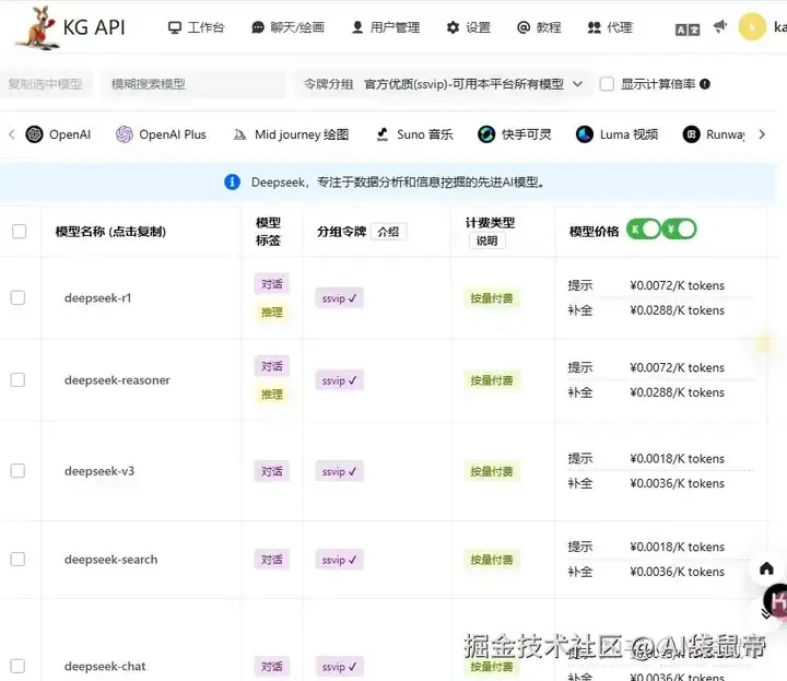 不管使用DeepSeek官方API,还是kg中转站的API,都能调用到DeepSeek。