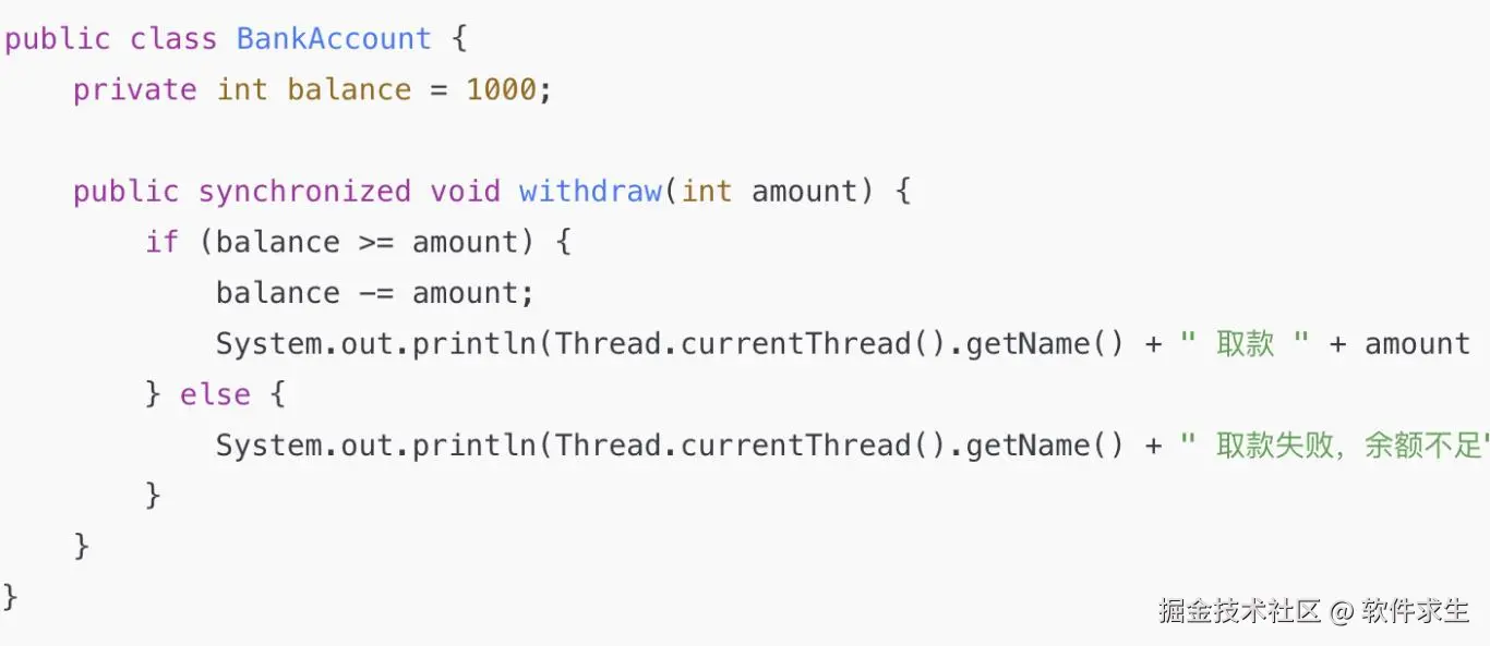- synchronized 关键字加在 withdraw 方法上,保证同一时刻只有一个线程能执行取款操作,避免数据不一致的问题。
