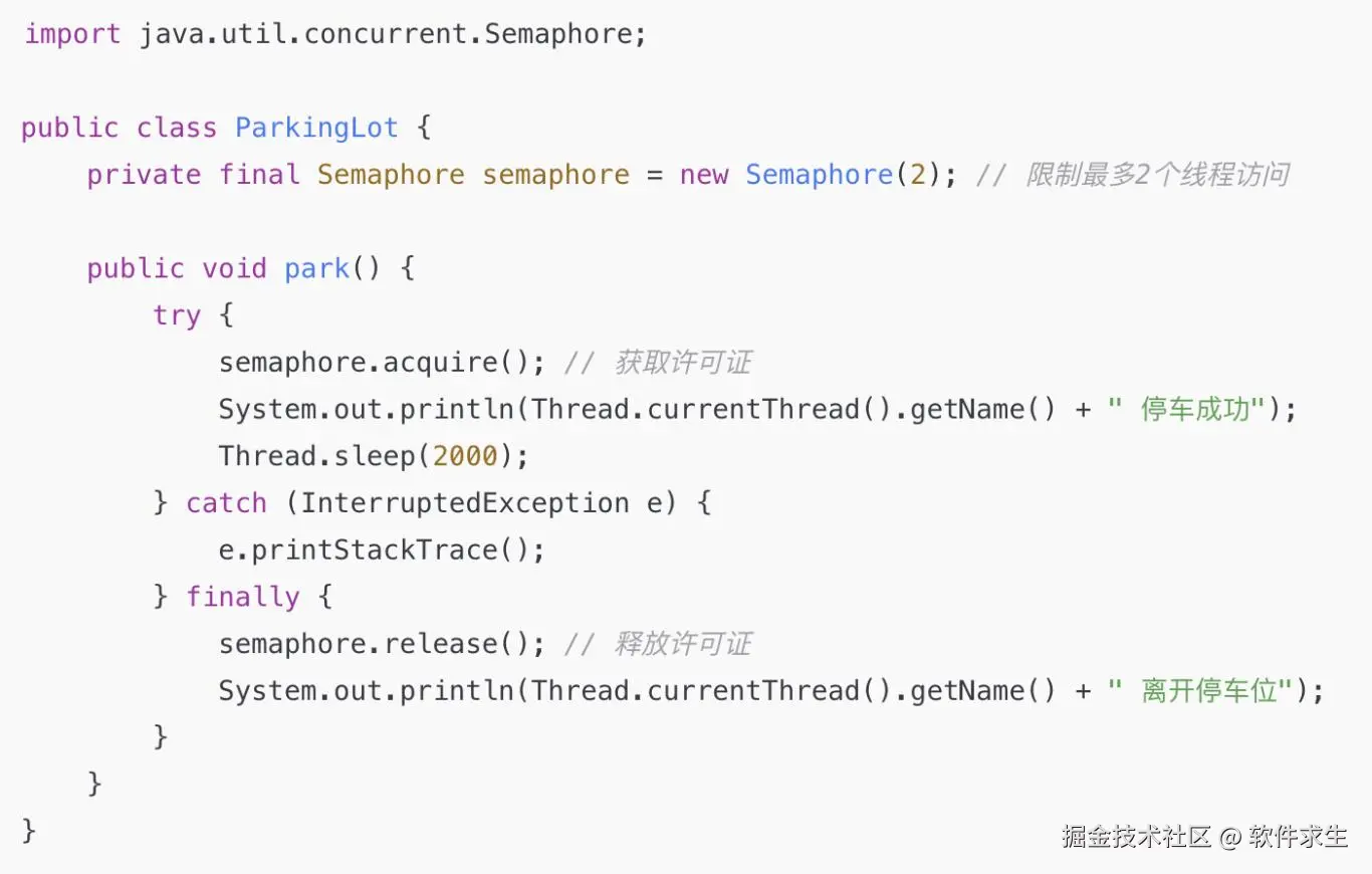 - semaphore.release() 释放许可证,让其他线程可以访问。