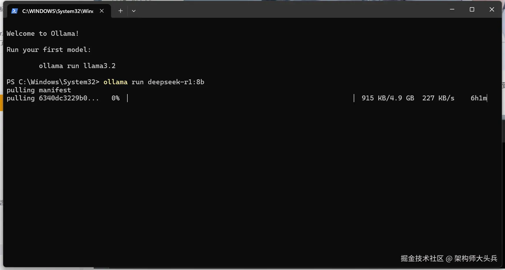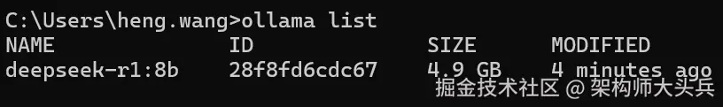版本:8b,(需要4.9GB空余空间)ollama run deepseek-r1:8b