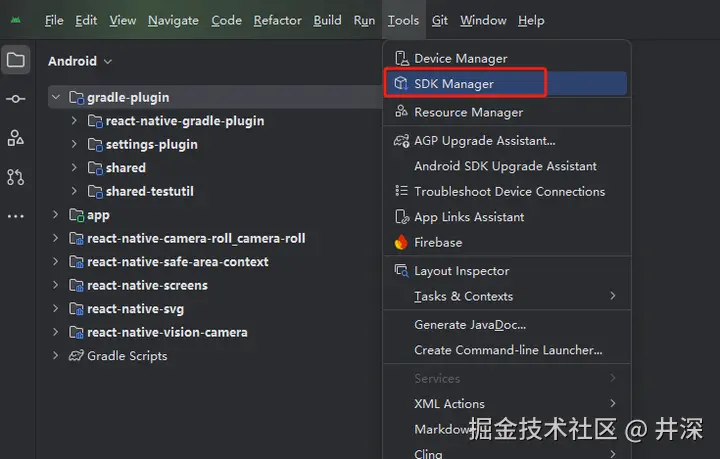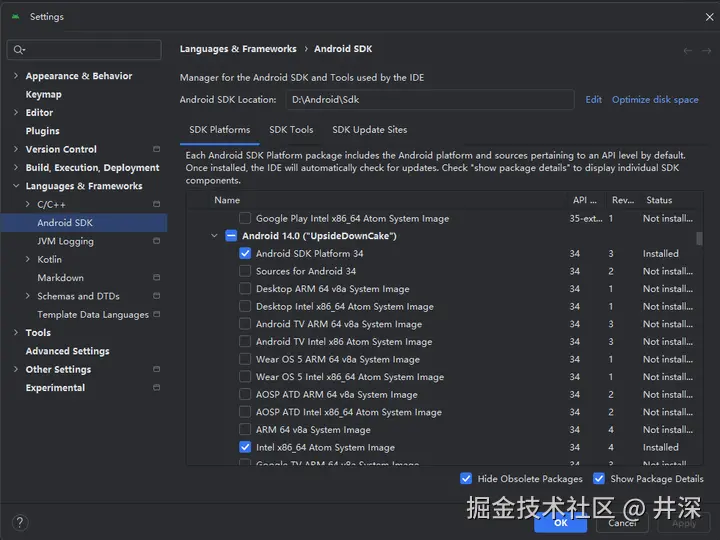 - Android Studio - 直接从 官网 下载,安装界面中选择"Custom"选项,确保选中了以下几项 Android SDK, Android SDK Platform, Android Virtual Device ,如果选择框是灰的,可以先跳过,稍后再来安装这些组件,然后点击"Next"来安装选中的组件;Android Studio 默认会安装最新版本的 Android SDK,目前编译 React Native 应用需要的是Android 14 (UpsideDownCake)版本的 SDK,需要在 Android Studio 的 SDK Manager 中选择安装,SDK Manager 可以在欢迎界面的 More Actions 中找到,如果已经过了欢迎界面,也可以在菜单栏中找到,如图2,打开 SDK Manager 后,已安装的不用管,勾选如图3所示的 SDK,最后点击"Apply"来下载和安装这些组件;Android Studio 安装完成后需要设置环境变量,这里不赘述了,如图4所示。