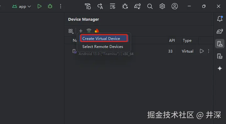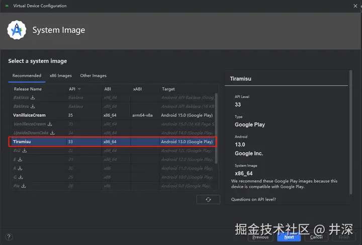 Android Studio 安装好了后,默认是有一个模拟器的,这里根据 React Native 的需要创建一个 Tiramisu API Level 33 image 的模拟器。