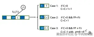 当计数值越大时,衰减概率越低,可以保证低频元素被快速剔除,同时保证高频元素较低的衰减概率从而保证频次的精确度