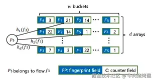 HeavyKeeper 的数据结构保存了一个哈希指纹和一个计数值,使用多个独立的哈希函数将输入元素映射到二维数组的不同位置。每个元素会通过所有哈希函数被映射多次,并更新对应位置的计数值
