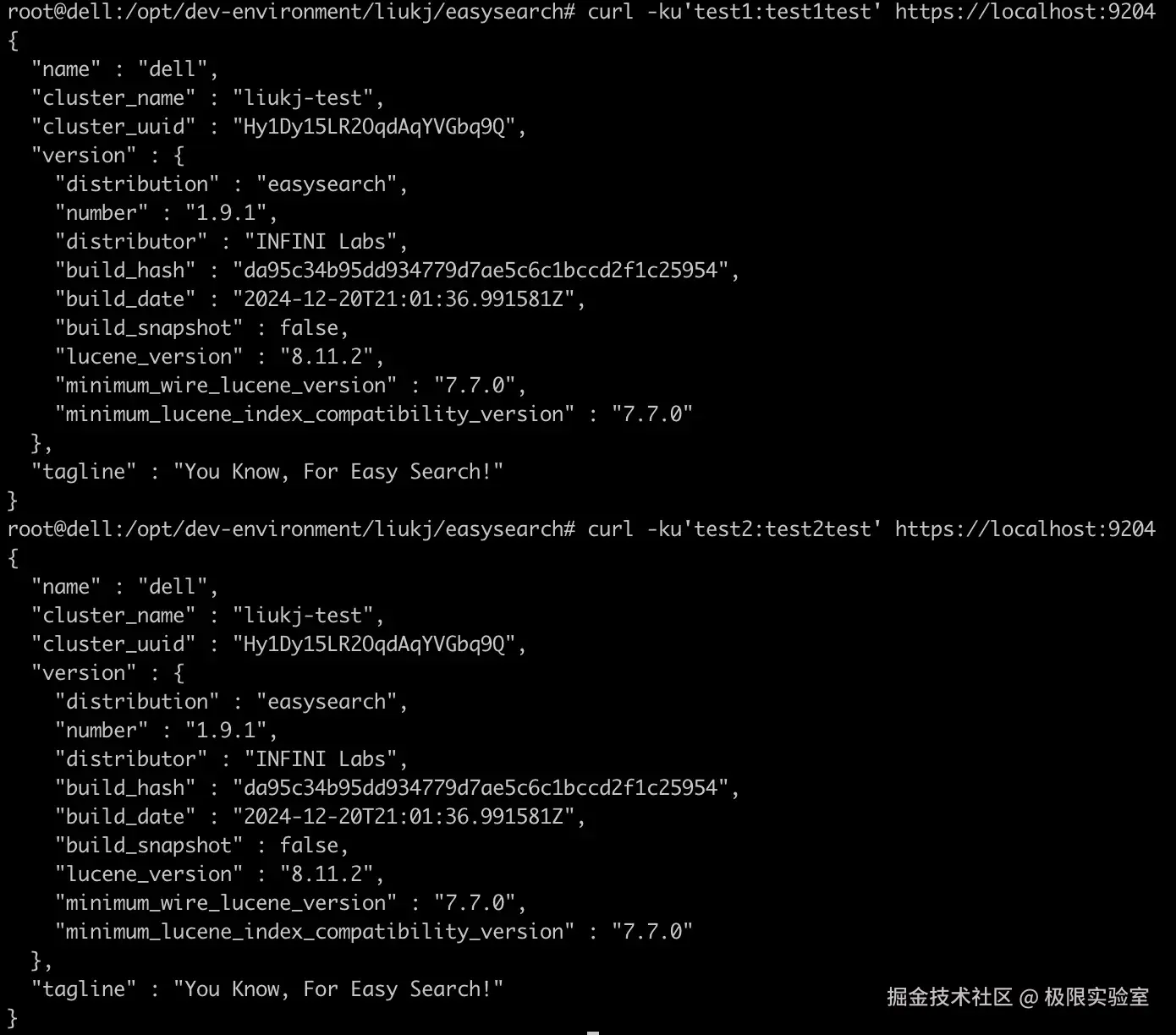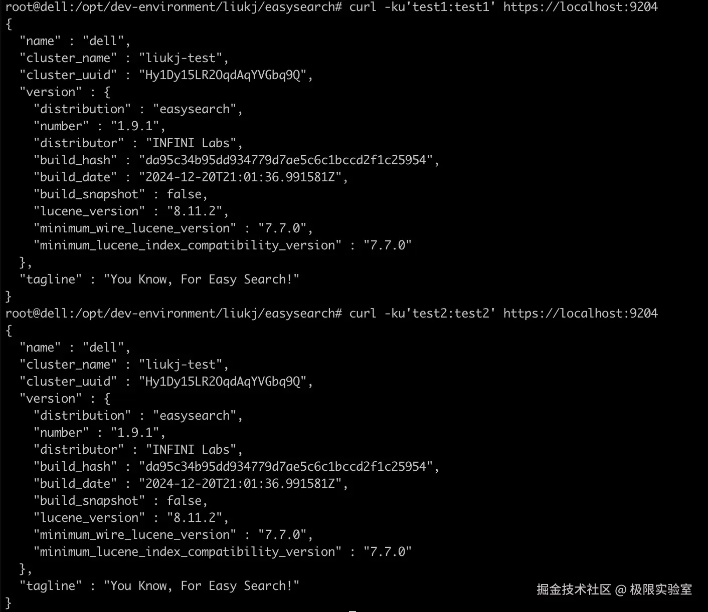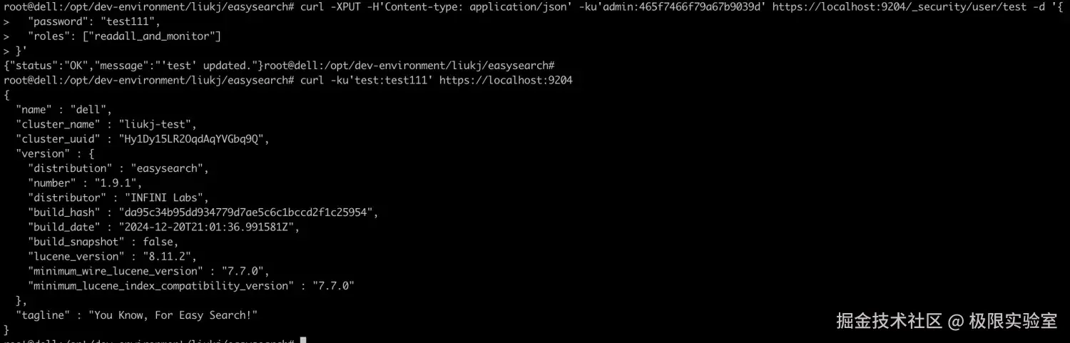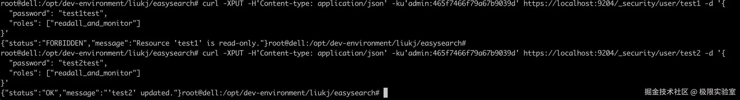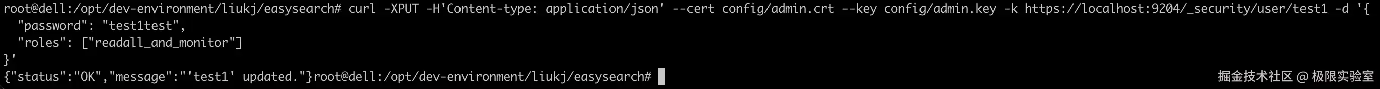 用户 test1 重置失败,用户 test2 重置成功。用户 test1 重置失败是因为配置了 reserved: true,将用户 test1 指定为内置用户,使用用户 admin 会因为权限无法进行密码重置,那就需要使用有更高权限的管理证书进行密码重置。默认在 Easysearch 集群执行初始化脚本 bin/initialize.sh 时,会在 config 目录下生成证书文件,其中 admin.crt、admin.key 为管理证书。