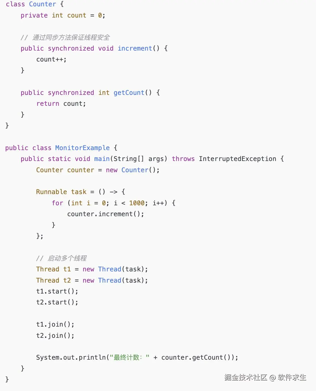 - 我们定义了一个Counter类,它有一个count字段,并提供了increment()和getCount()方法。