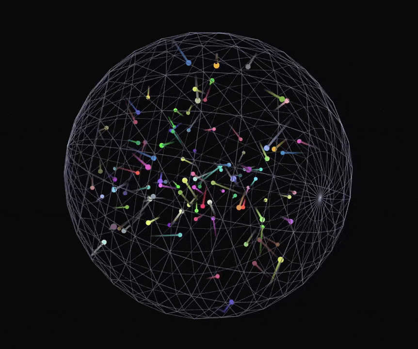AIGC 从业者 @myapdx 用了一个更加复杂的同类提示词来测试 o3-mini 和 DeepSeek R1:编写一个 p5.js 脚本,模拟 100 个彩色小球在一个球体内部弹跳。每个小球都应留下一条逐渐消失的轨迹,显示其最近的路径。容器球体应缓慢旋转。请确保实现适当的碰撞检测,使小球保持在球体内部。