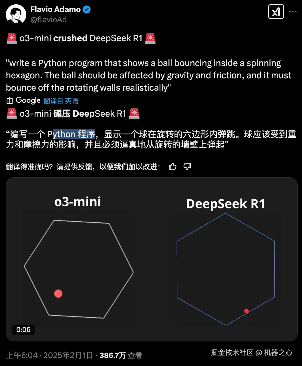 也就是分别让 o3-mini 和 DeepSeek R1 写一个球在旋转的六边形内弹跳的 python 程序,小球跳动的过程中要遵循重力和摩擦力的影响。最后的展示效果如下: