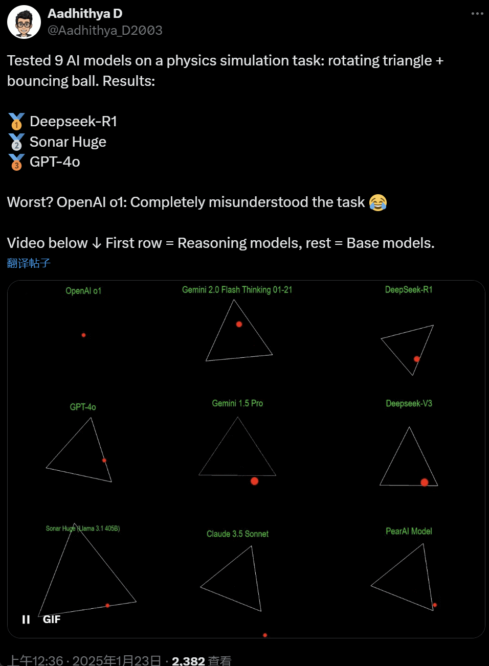 至于为什么会出现这样的差异,Yuchen Jin 和 @myapdx 都在帖子中提到,这个任务对模型如何理解真实世界的物理规律有所反应。模型需要综合自己对语言、几何、物理和编程的理解,方能得出最后的模拟结果。从前两轮的结果看来,o3-mini 有可能是物理学得最好的大模型。