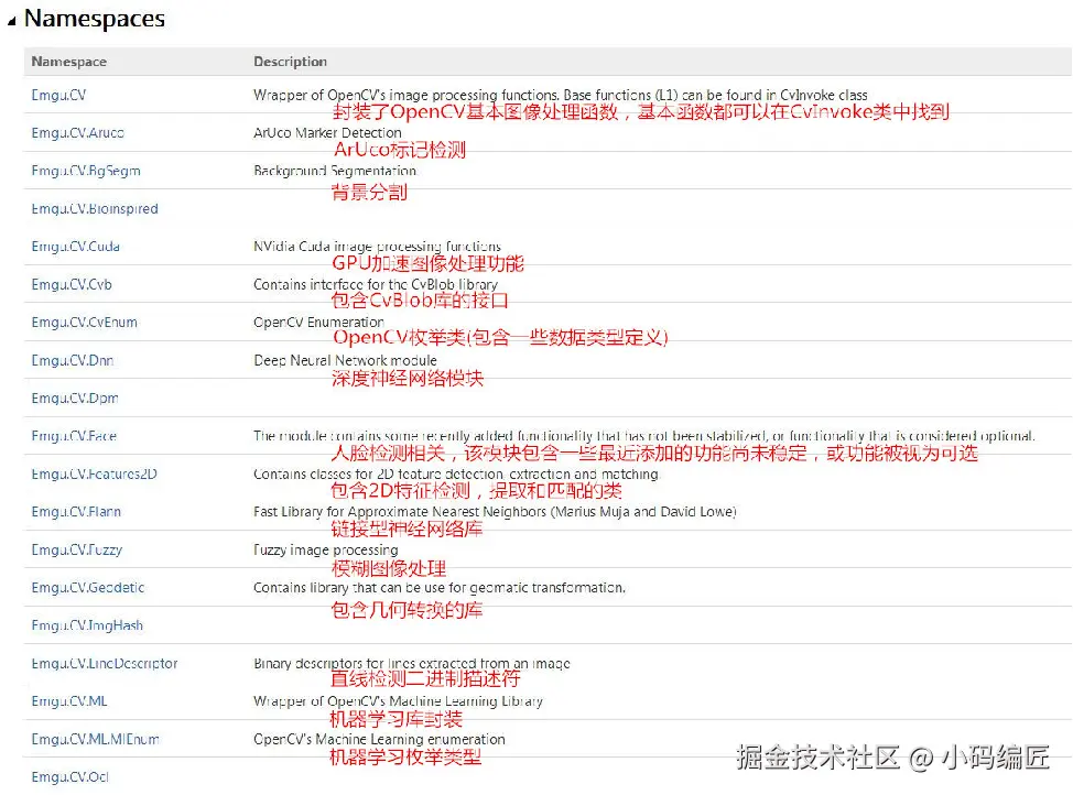 然后EMguCV的一些模块的介绍见下图