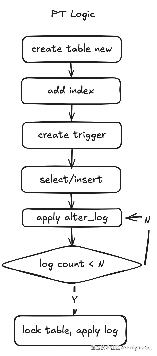 上述就是 PT 工具的执行逻辑,可以看到,PT 完全依赖触发器,MySQL 5.6 及之前版本,一个操作只能建一个触发器,比如 insert 只能建一个触发器,如果表上已有触发器,就不能使用 PT,可以考虑 binlog 版本的 gh-ost