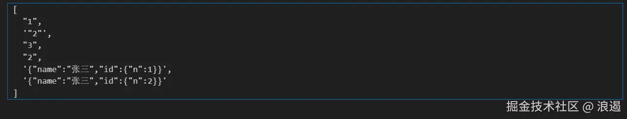 这里,虽然数组中有两个看起来一样的对象 { name: '张三', id: { n: 1 } },但它们在内存中是不同的对象,具有不同的内存地址,所以 Set 会把它们当作不同的元素保留下来,无法实现对对象元素的去重。
