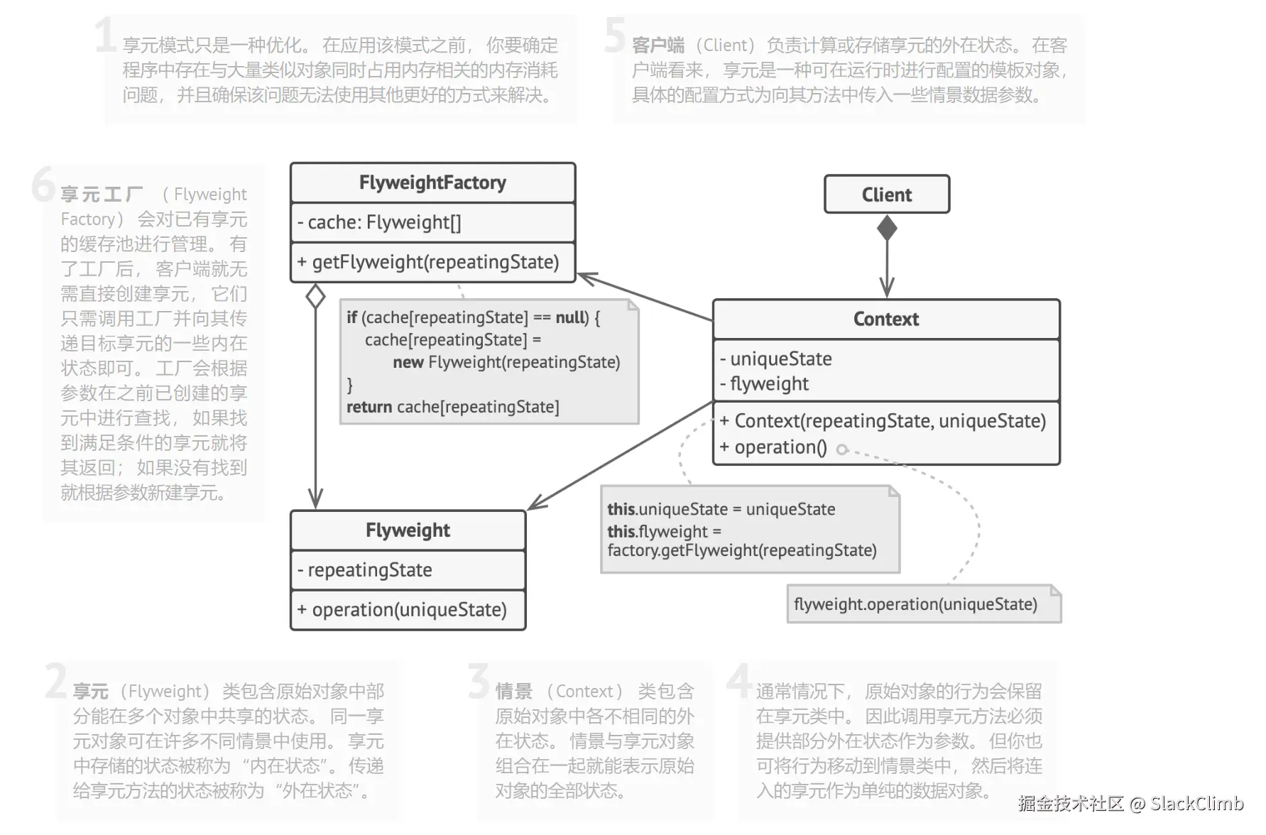 - 用来管理享元对象的工厂类,确保共享对象的唯一性。