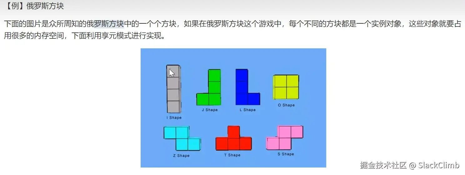 - 内部状态:存储在享元对象内部的、不会改变的状态,通常是可以共享的。