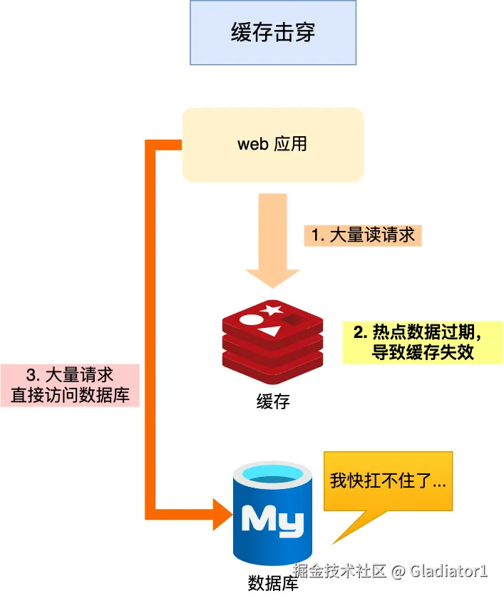 如果缓存中的某个热点数据过期了,此时大量的请求访问了该热点数据,就无法从缓存中读取,直接访问数据库,数据库很容易就被高并发的请求冲垮,这就是缓存击穿的问题。