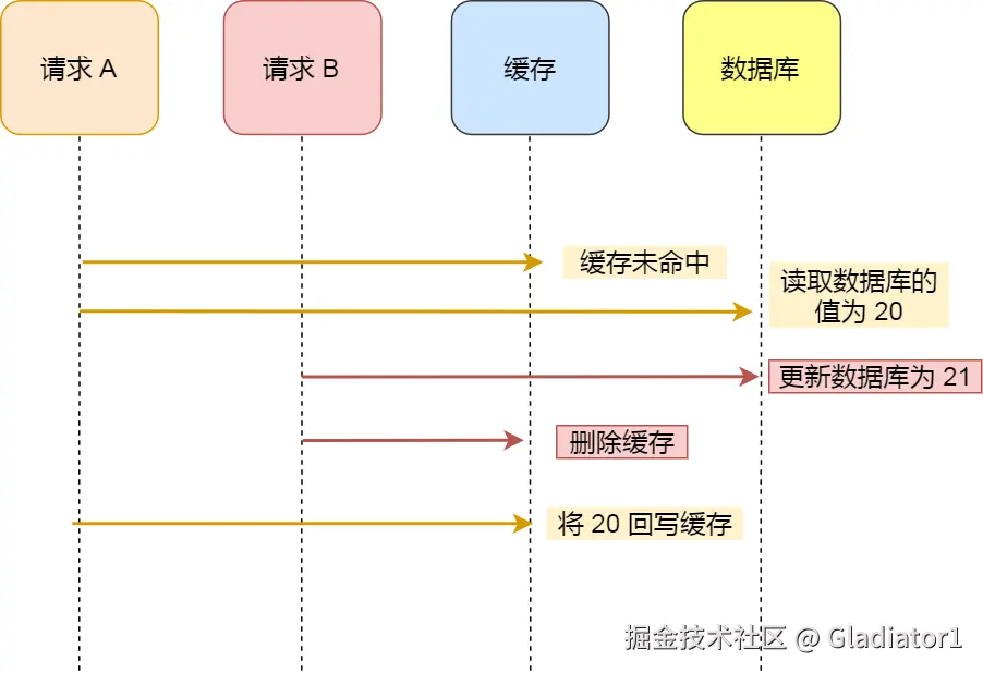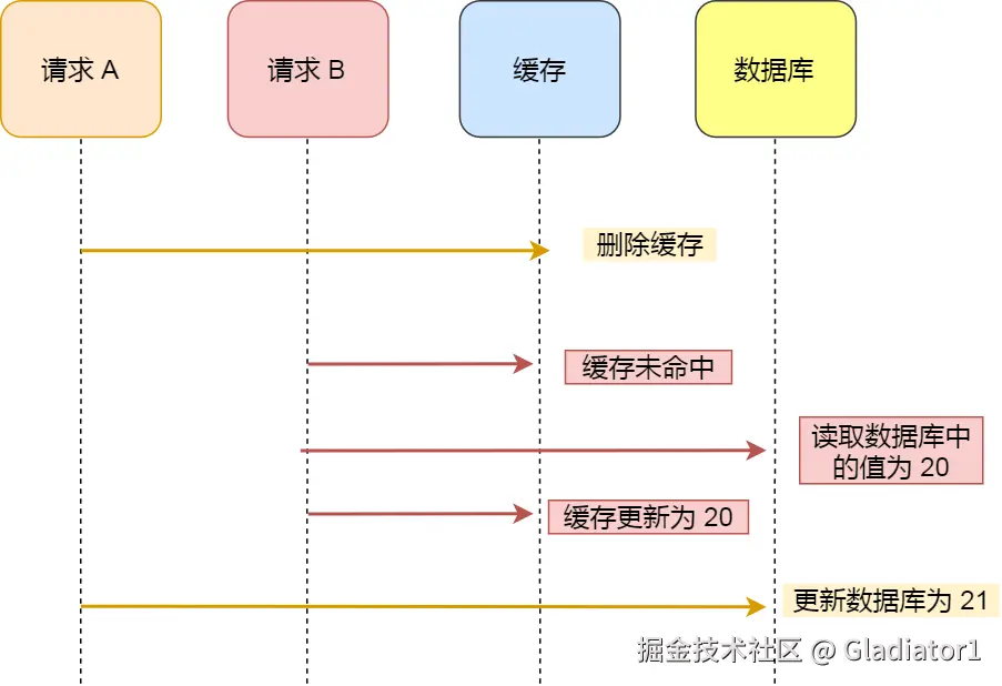 举个例子,假设某个用户的年龄是 20,请求 A 要更新用户年龄为 21,所以它会删除缓存中的内容。这时,另一个请求 B 要读取这个用户的年龄,它查询缓存发现未命中后,会从数据库中读取到年龄为 20,并且写入到缓存中,然后请求 A 继续更改数据库,将用户的年龄更新为 21。