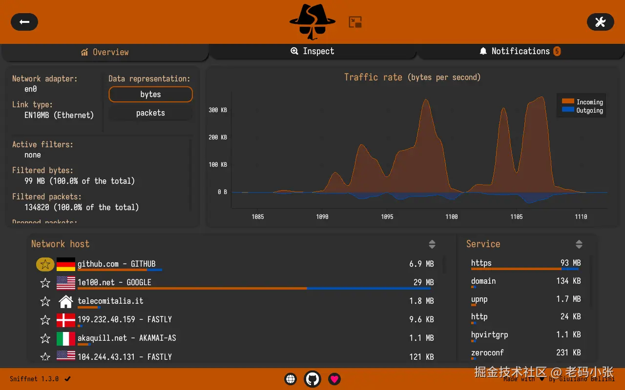 Sniffnet[1] 是一款跨平台的开源应用,旨在帮助你以直观的方式监控互联网流量。它支持多个平台,包括 Windows、macOS 和 Linux,界面简洁明了,操作也非常简单。它的核心特点就是让你能够实时查看网络流量,轻松定位问题,甚至还能对流量进行详细分析。