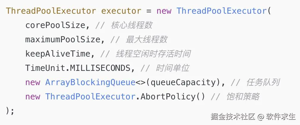 在这个构造方法中,AbortPolicy就是默认的饱和策略。如果你想使用其他的策略,可以将其替换为CallerRunsPolicy、DiscardPolicy、DiscardOldestPolicy。