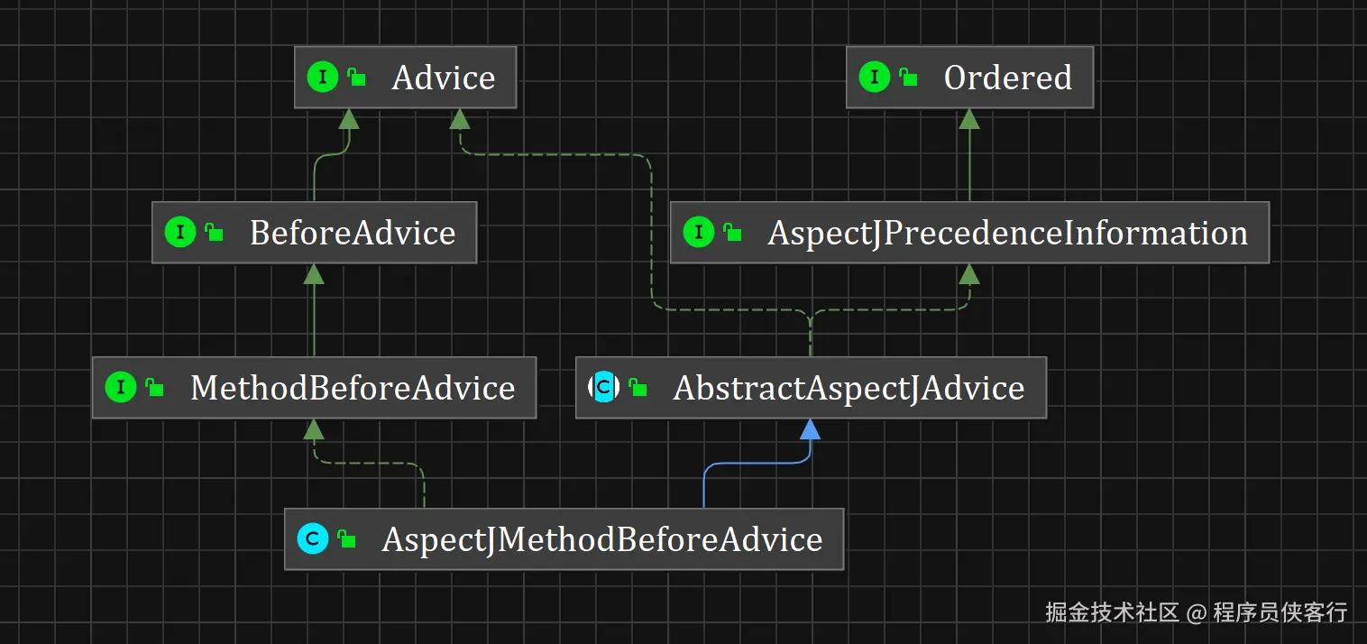 - MethodBeforeAdvice接口,对应@Before,实现类AspectJMethodBeforeAdvice