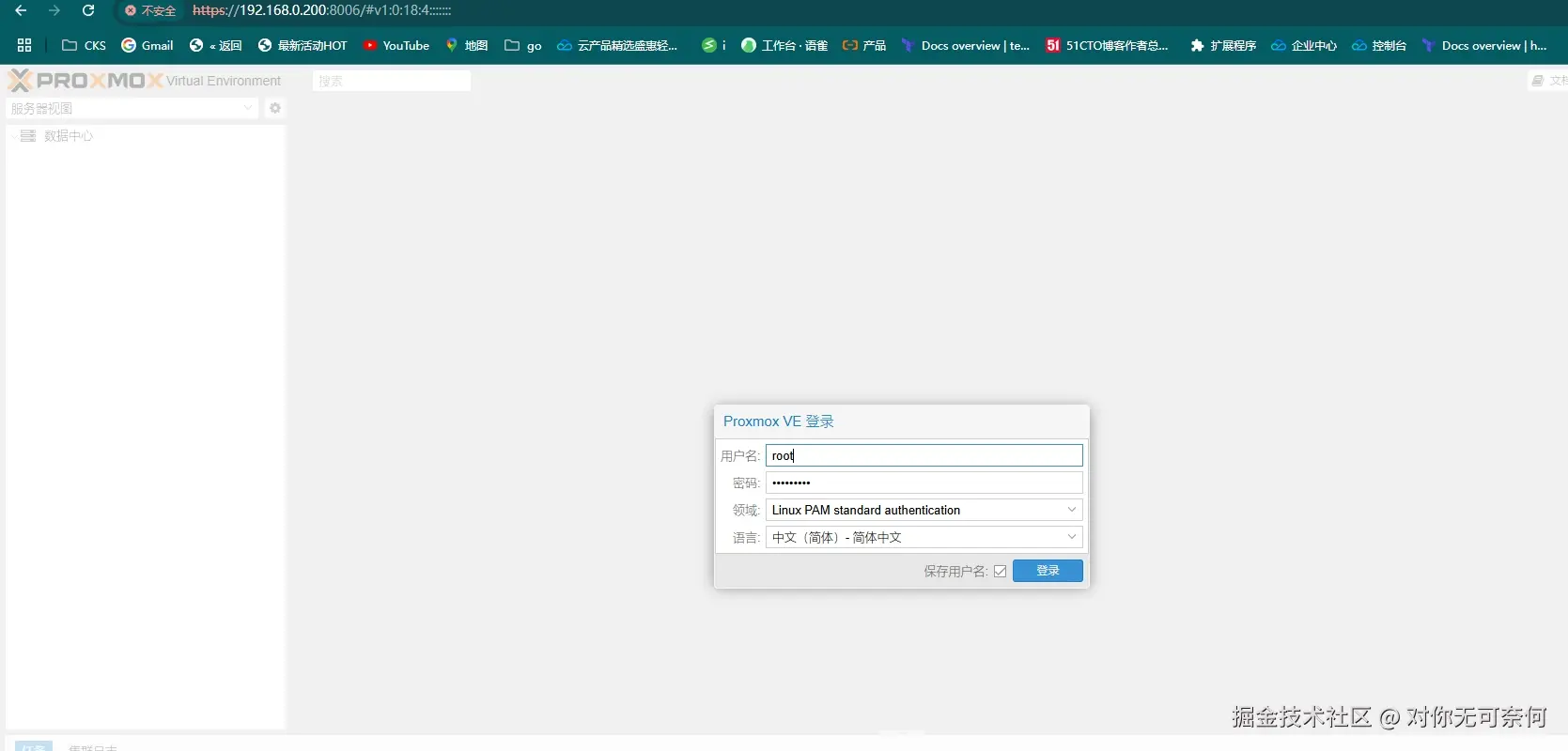 也通过局域网内另外一台pc的浏览器登录https://192.168.0.200:8006/进入web控制台: