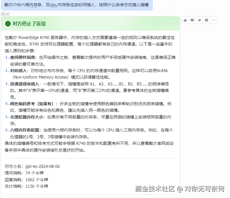 我插入的内存条应该是128g ,上面只识别了 96g。 why?想了一下服务器是双cpu,内存插槽应用是双通道有顺序的,怀疑我插入的插槽不对(or真的没有插紧)?问了一下chagpt