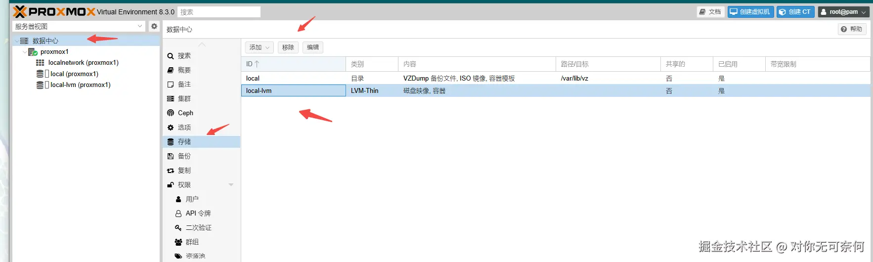 PVE默认将硬盘分成两个分区,存放备份和镜像的local 和 存放实际虚拟机数据的local-lvm