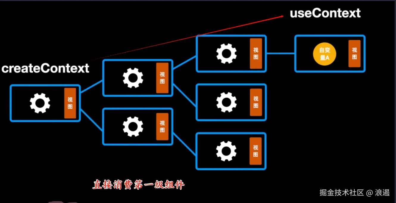 比如上面的序号 1 组件到 序号 2 组件 , 需要把自变量从第一级组件跑到第四级组件 , 十分繁琐 , 于是我们使用 useContext