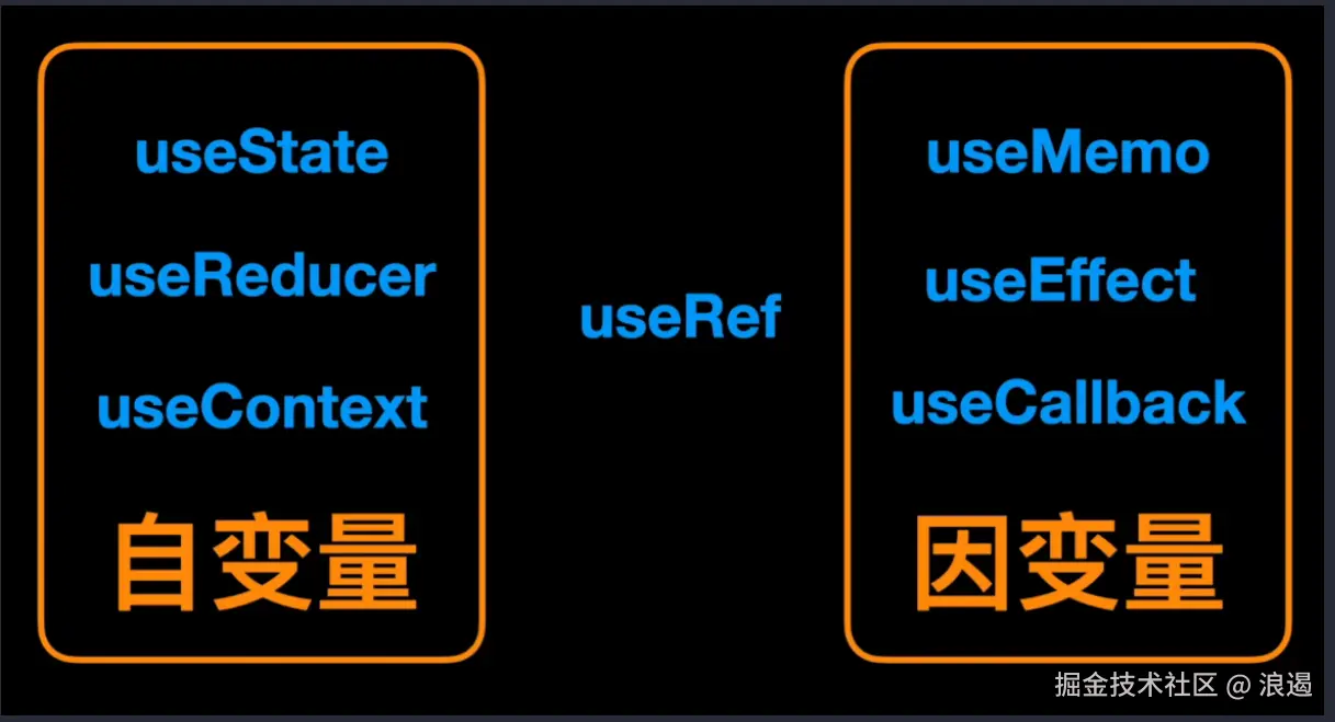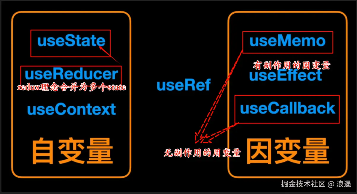 到此剩下 useRef , 作为自变量和因变量的 hooks 组件总结如下 :