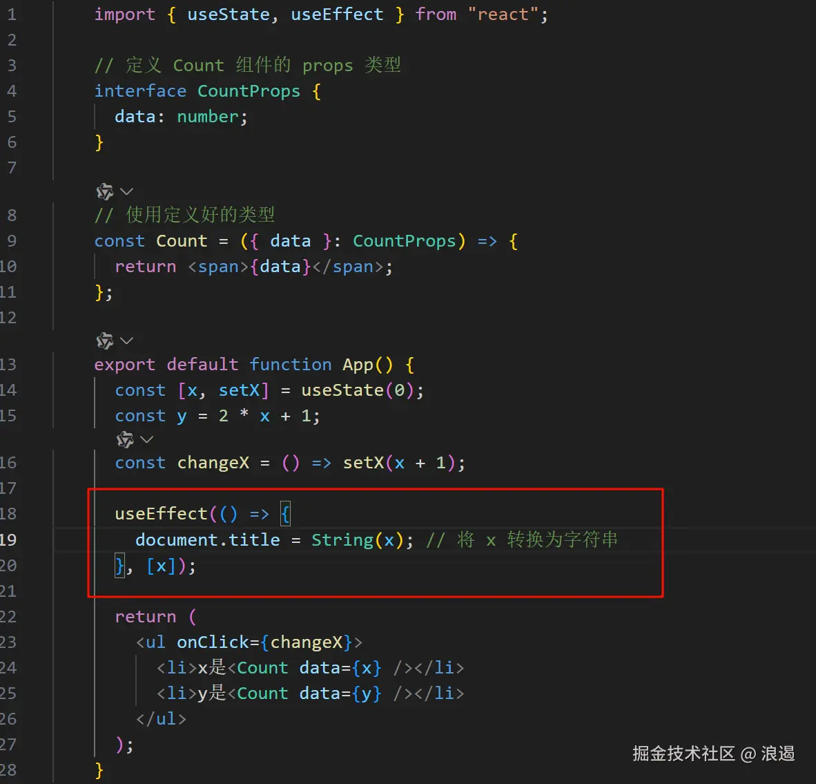 在这个例子中,当x发生变化时,useEffect会执行,将页面标题设置为x的值。这种操作属于副作用,因为它改变了组件外部的状态。