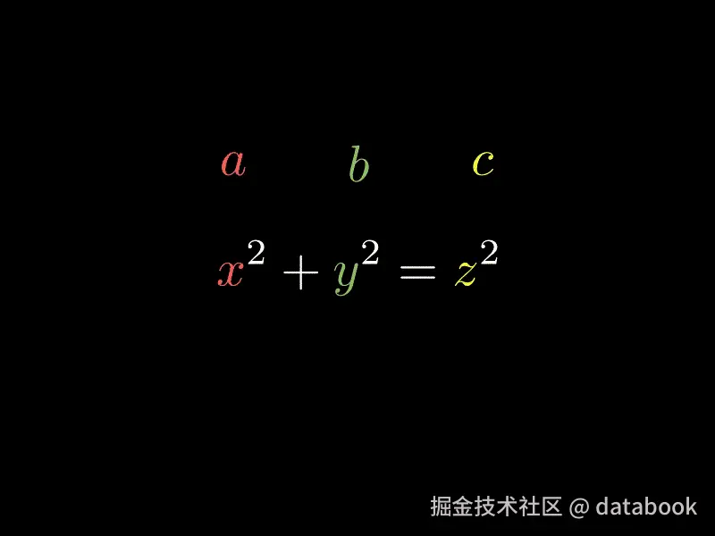 f2 = MathTex("{{x}}^2", "+", "{{y}}^2", "=", "{{z}}^2")