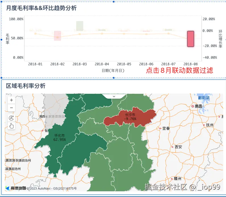 - 通过组件间联动,查看8月份各省份-城市的毛利率情况