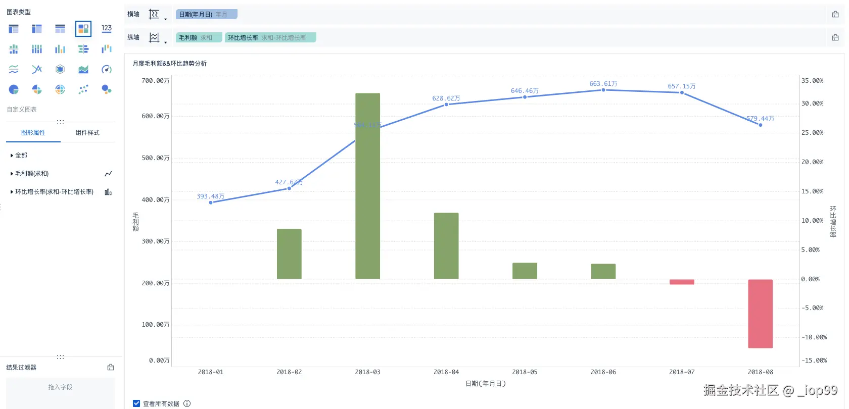 - 为了进一步发现问题,同样制作“月度毛利额&&环比”