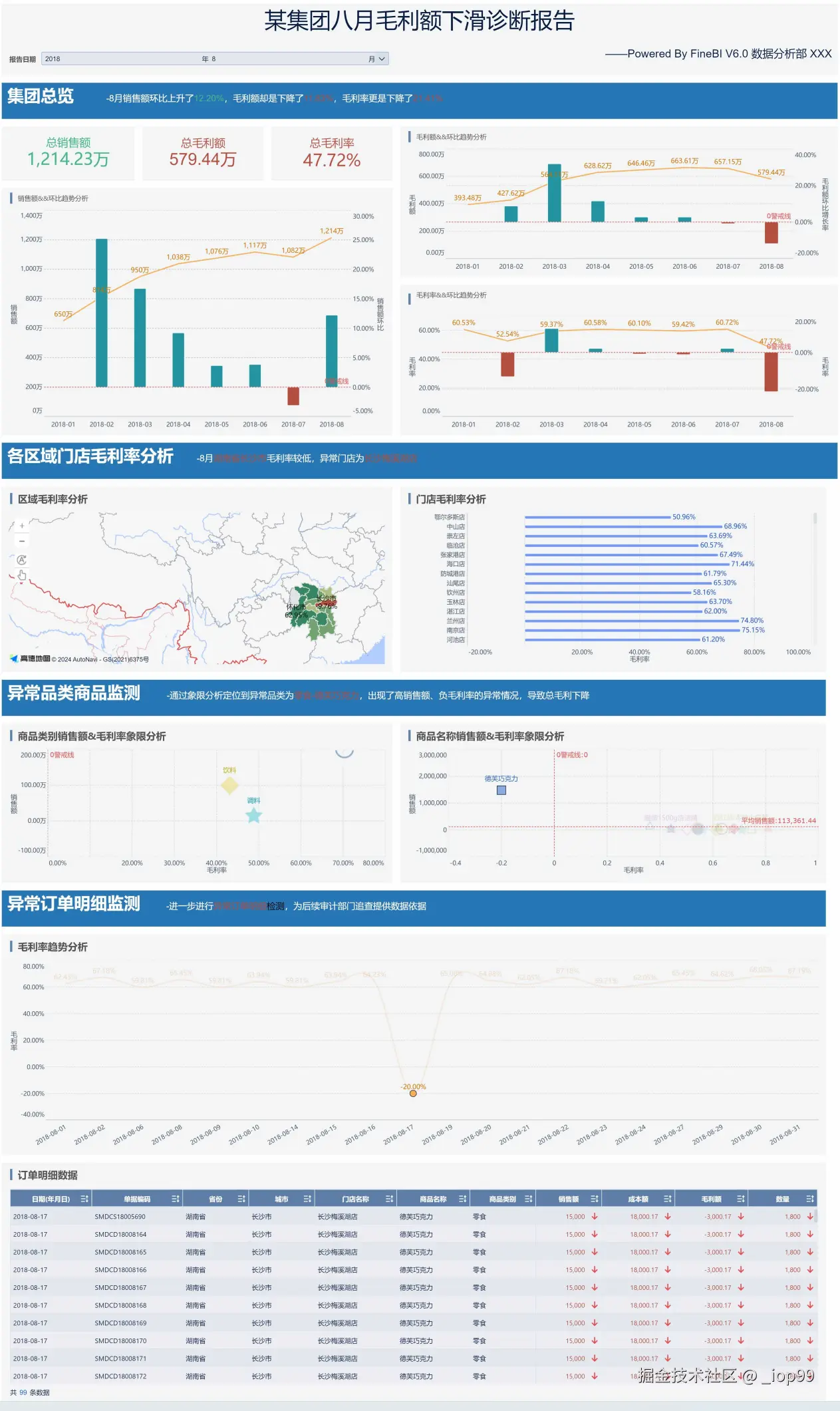 - 集团8月毛利总额下滑 → 使用FineBI层层深入 → 发现元凶为湖南省长沙市梅溪湖店8月17日德芙巧克力大量异常销售。