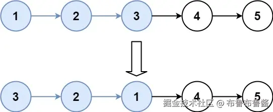 temp记录当前节点(cur)的next,再将当前节点(cur)指向上一个节点(prev),将prev指针移动到cur,将cur指针向后移动到temp - 连接翻转后的链表,同时将链表剩余长度减去k,